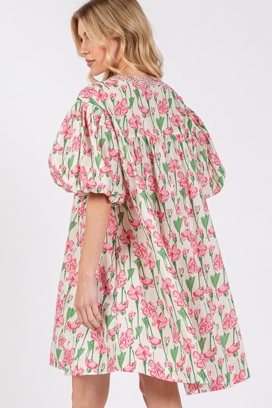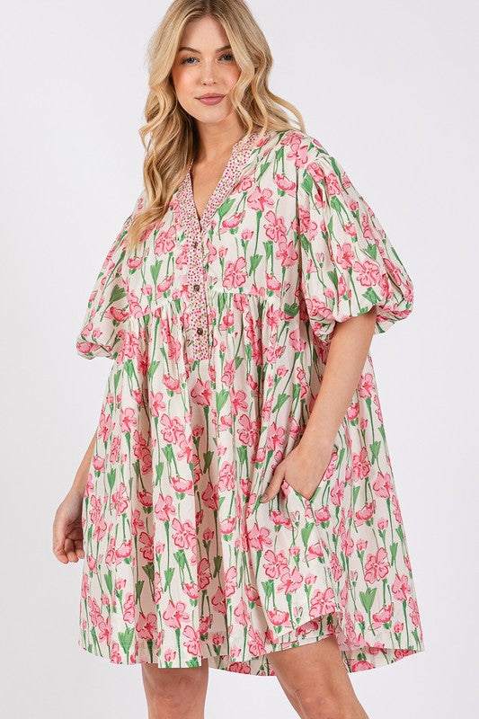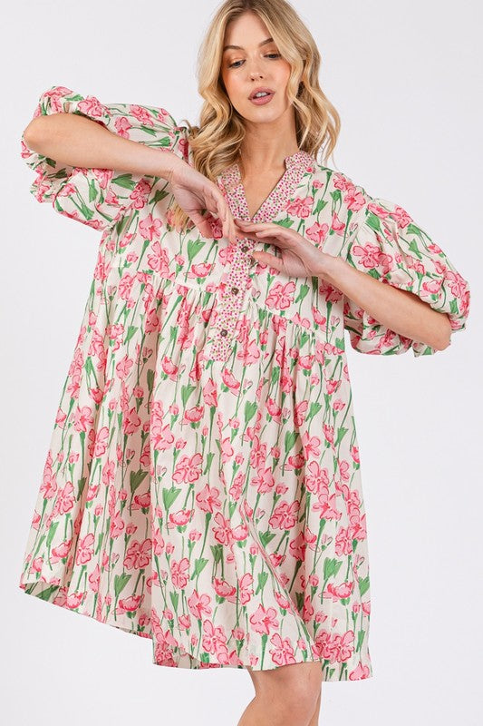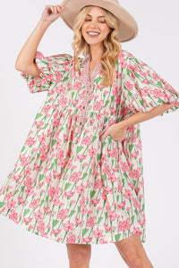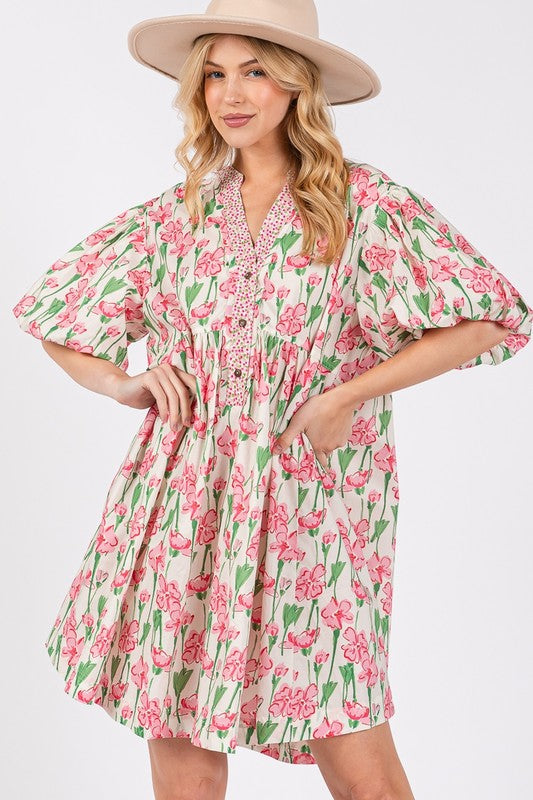 SAGE + FIG Floral Half Button Notched Puff Sleeve Dress - Pink / S